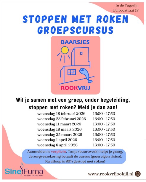 Wil je samen met een groep, onder begeleiding, stoppen met roken? Op 18 februari is  er weer een nieuwe groepscursus van start gegaan. Aanmelden kan via de website www.rookvrijookjij.nl, of via buurtwerker Tanja uit de Tagerijn. Voor vragen kan je ook altijd even bellen met Sinefuma 076-8895 195 of buurtwerker Tanja 06 27188014.