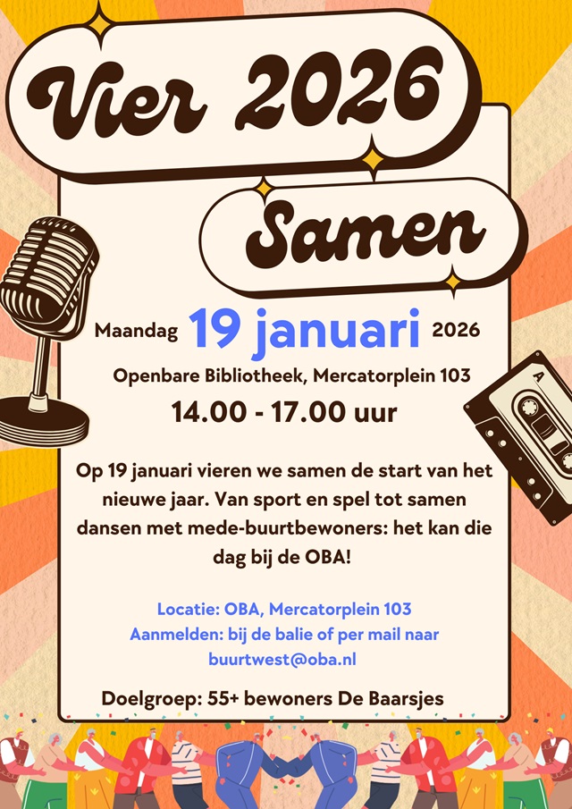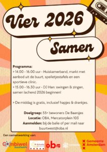 Ben je 55 of ouder? Vier dan 2026 samen op maandagmiddag 19 januari vanaf 14:00 uur in de OBA op het Mercatorplein. Er is muziek van de Huiskamerband en een DJ, een boksclinic, informatie over activiteiten in de buurt en natuurlijk hapjes en drankjes! De flyer met alle details zie je hier hieronder. Wil je je aanmelden? Mail dan naar buurtwest@oba.nl, neem contact op via Whatsapp of bel naar 020 – 753 95 31.
