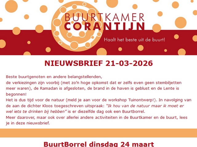 - In Balans Cursus op maandag en donderdag van 13 tot 14 uur. Deze gratis cursus is al begonnen. Check of je nog mee kan doen via de contactgegevens op deze pagina: www.buurtkamercorantijn.nl/in-balans.